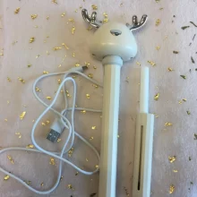 A very nice and elegant humidifier. It works perfectly. It is plastic (tough), colored white. The horns and nose are metallic in color. Comes with a manual, a cable to be able to charge. Add that the power button is the nose.